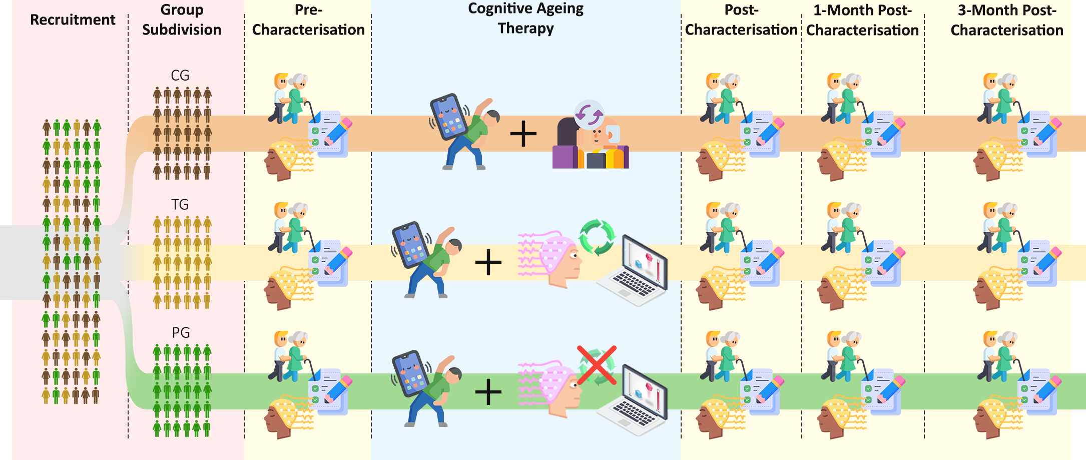 The characterization of users' cognitive functions will be performed 4 times: before training, just after training, 1 month after and 3 months after. The characterization is composed of a battery of neuropsychological tests, baseline EEG recordings and smartphone assessment.